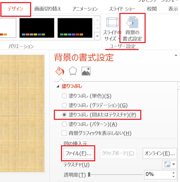 パワーポイントのスライドで、自分の好きな背景を使うにはどうすれば